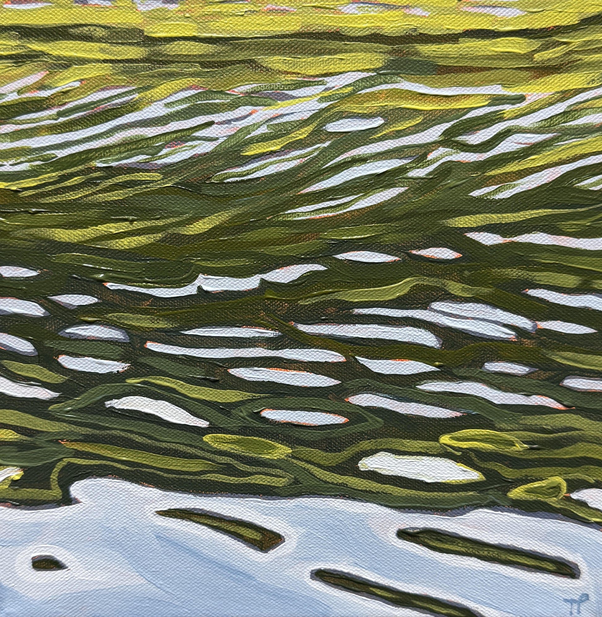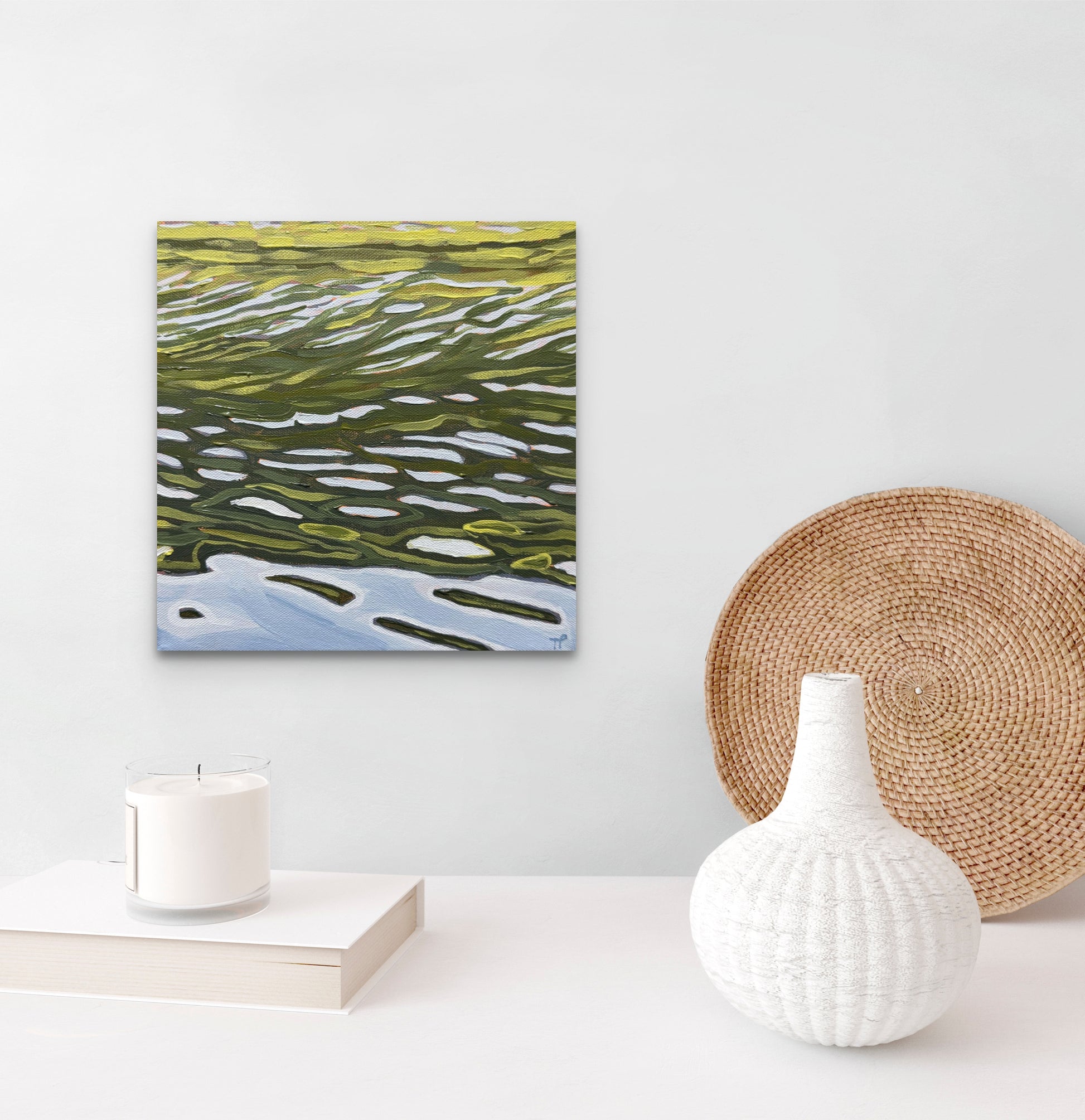 10" x 10" x 1.5" deep canvas. Acrylic with a varnish sealant. The piece is unframed.